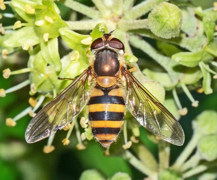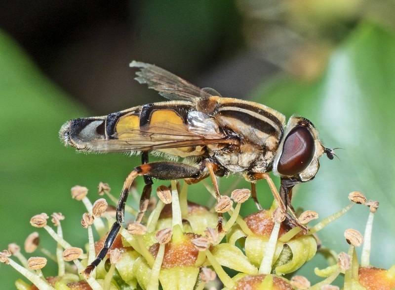 Crops, gardens and natural vegetation began to recover from the summer drought but, with some exceptions, the number and variety of insects collapsed. Most flowers had already finished, though a few Grass-of-Parnassus blooms could be seen in dune-slacks until the end of the month. However, the main source of nectar and pollen was flowering Ivy. I made numerous visits to favoured, south-facing Ivy patches at Oxford Road and Hesketh Road in Southport, Ravenmeols, Formby, and a newly discovered clump at Kenilworth Road, Ainsdale. Apart from abundant Common Wasps, the Ivy attracted encouraging numbers of the Ivy Bee. About the same size as a Honeybee, this charming solitary bee has a chestnut thorax and a stripy, humbug-like abdomen. It colonised southern England from continental Europe in 2001, rapidly spreading northwards until the first Sefton record by Pete Kinsella in 2018 at Crosby. It has now reached south-east Scotland. In the first half of September, there was also the occasional Hornet Plumehorn on the Ivy. Our largest and most spectacular hoverfly, this is another insect responding to climate change over the last 20 years or so by moving north. It is a good mimic of the European Hornet, which has been slower to reach us but is now being found occasionally in the Northwest. Pete Kinsella, sent me an excellent photo of an enormous queen hornet on Ivy in Crosby. I also bumped into Pete at the Ravenmeols Ivy on 23rd. He pointed out some of the less common hoverflies, including the Black-horned Smoothtail and Pale-knobbed Lucent. There were also both males and females of the Shieldbug Fly, an unusual-looking insect with enormous red eyes, that has the unfortunate habit of parasitising shieldbugs. On the last day of the month, the Hesketh Road Ivy was graced by a large Lemon Marsh Fly, a hoverfly that often appears as a migrant. Butterflies were generally thin on the ground but, as usual, the superb Red Admiral put in an appearance. My best day-total of this butterfly was 22 on 25th. I also spotted two rather worn Painted Ladies on the Ivy; otherwise, there were just a few of the continuously brooded Speckled Wood and the odd Comma.